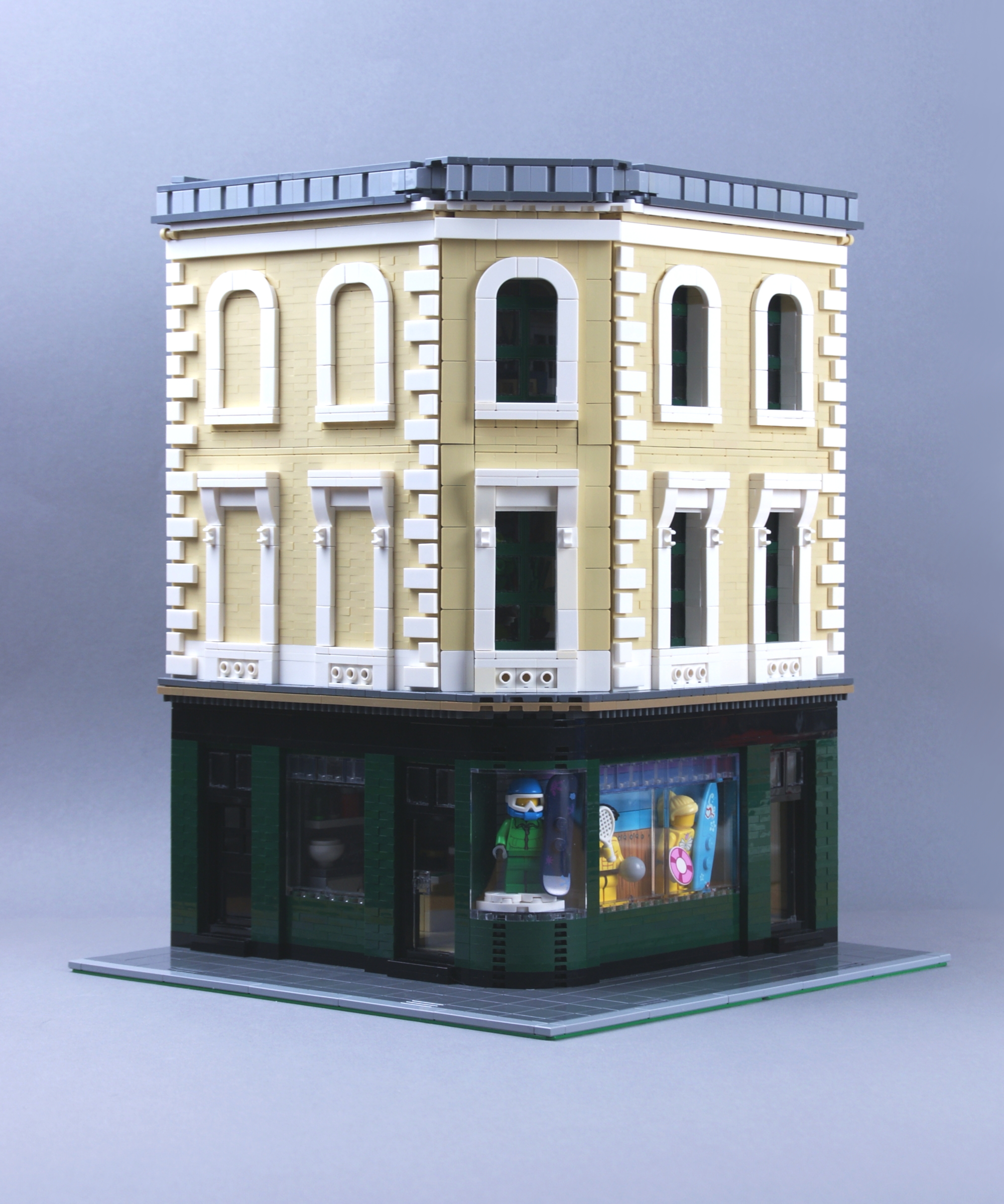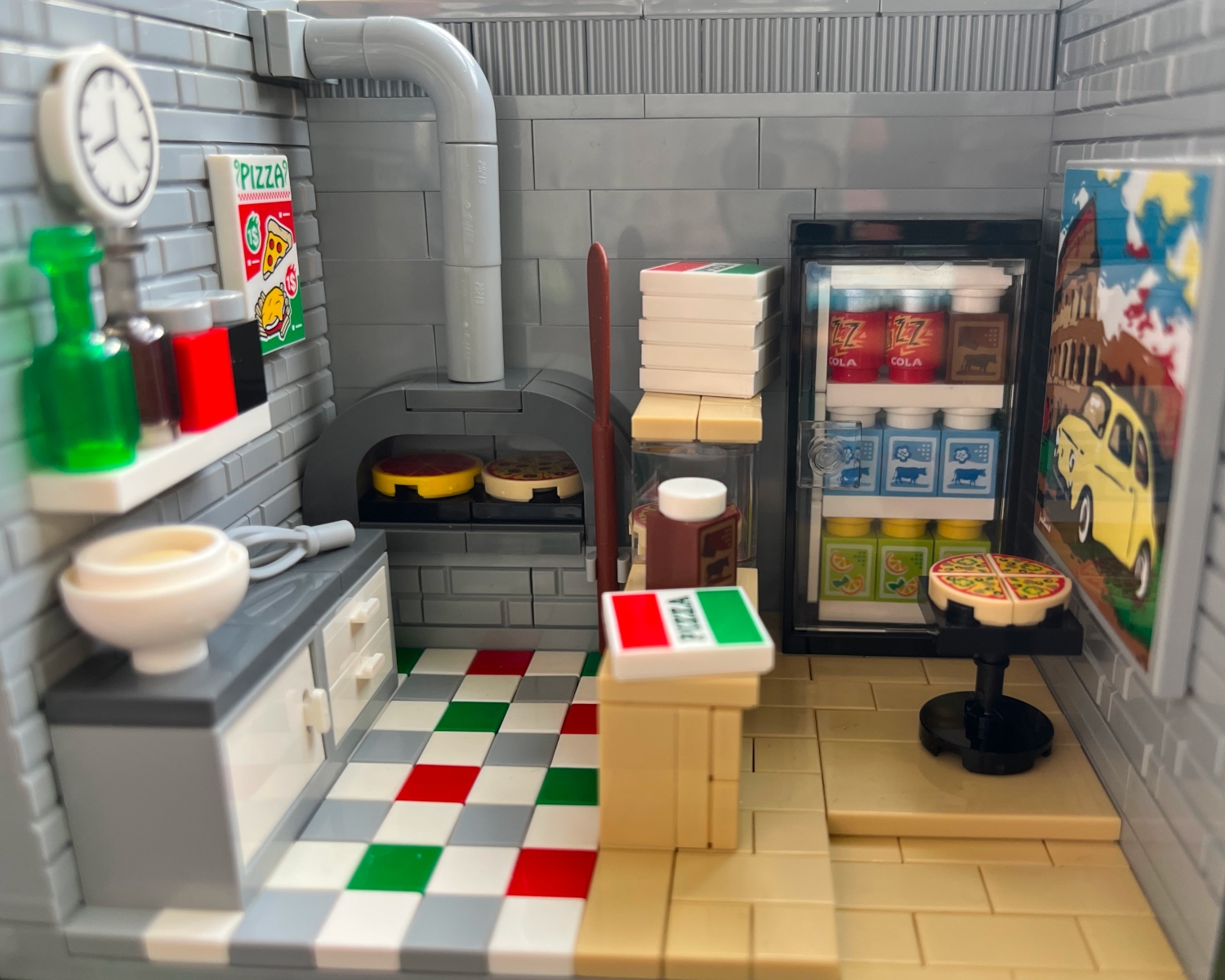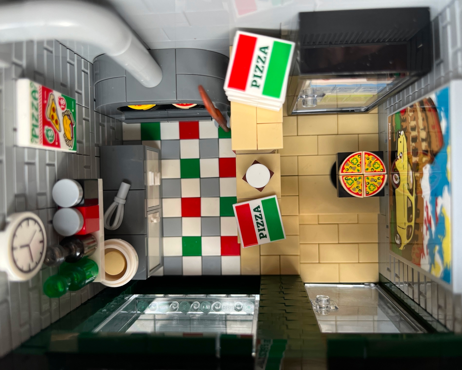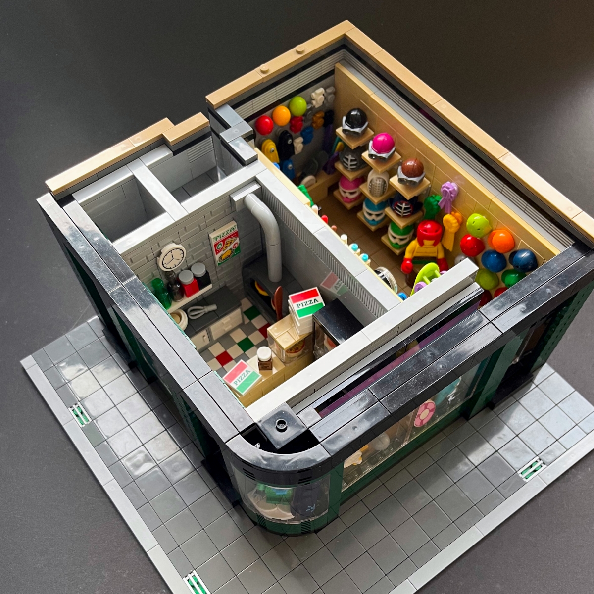 Pizzeria und Sportgeschäft01|2020 - 01|2025Modulares Gebäude. Das Haus basiert auf einem realen Gebäude in London (Redchurch Street 85). Begonnen habe ich damit im Januar 2020 und die Fassade war relativ schnell fertig. Allerdings hatte ich lange keine Idee für das Dach und die Inneneinrichtung. Im Januar 2021 habe ich die Pizzeria und den Sportladen eingerichtet, die erste Etage kam im Januar 2023 dazu. Im Januar 2025 habe ich schließlich die obere Etage und das Dach gebaut.