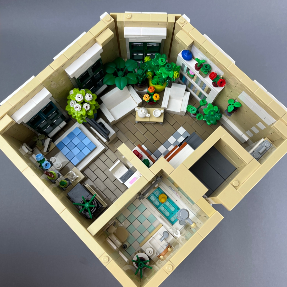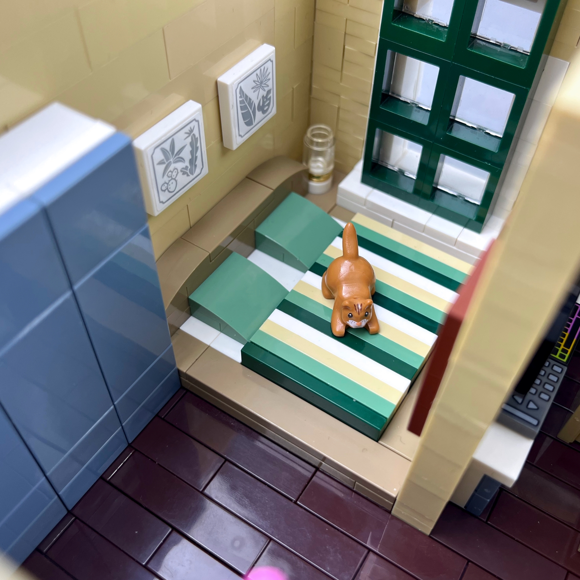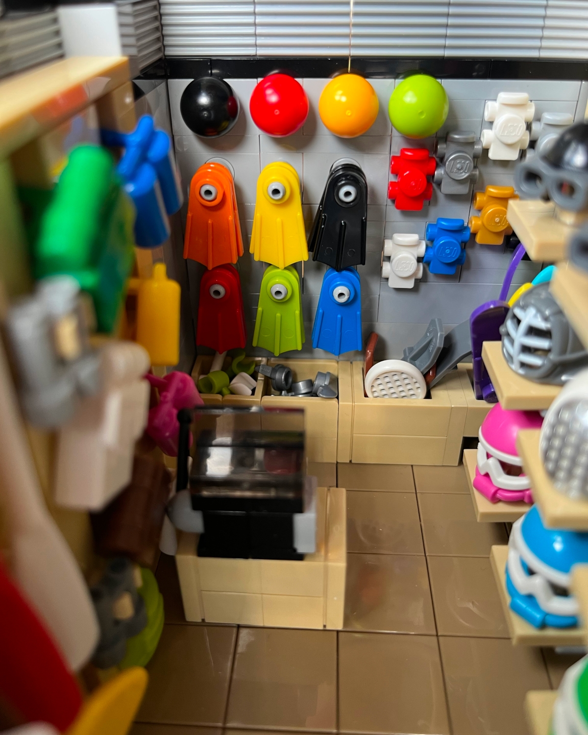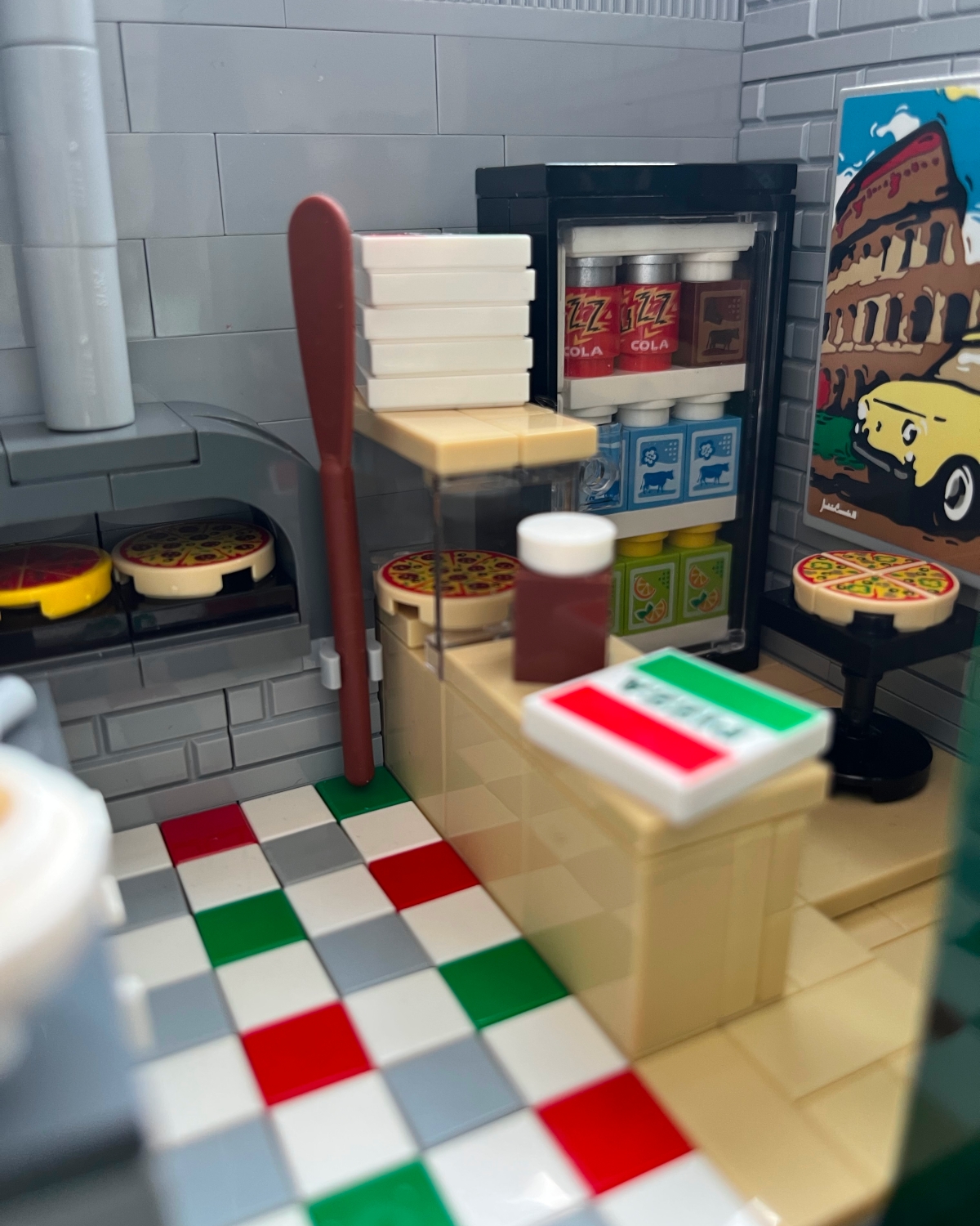 Pizzeria und Sportgeschäft01|2020 - 01|2025Modulares Gebäude. Das Haus basiert auf einem realen Gebäude in London (Redchurch Street 85). Begonnen habe ich damit im Januar 2020 und die Fassade war relativ schnell fertig. Allerdings hatte ich lange keine Idee für das Dach und die Inneneinrichtung. Im Januar 2021 habe ich die Pizzeria und den Sportladen eingerichtet, die erste Etage kam im Januar 2023 dazu. Im Januar 2025 habe ich schließlich die obere Etage und das Dach gebaut.
