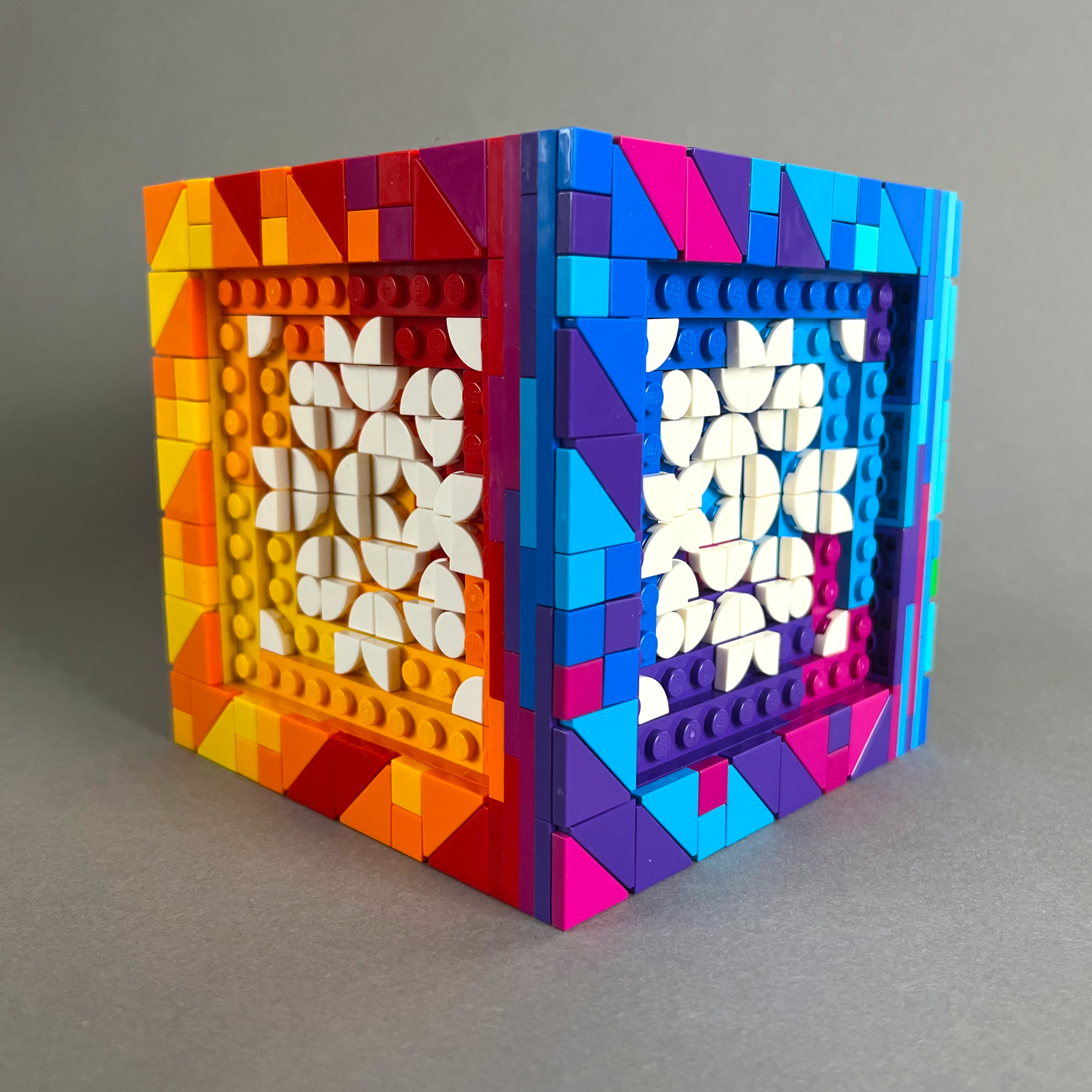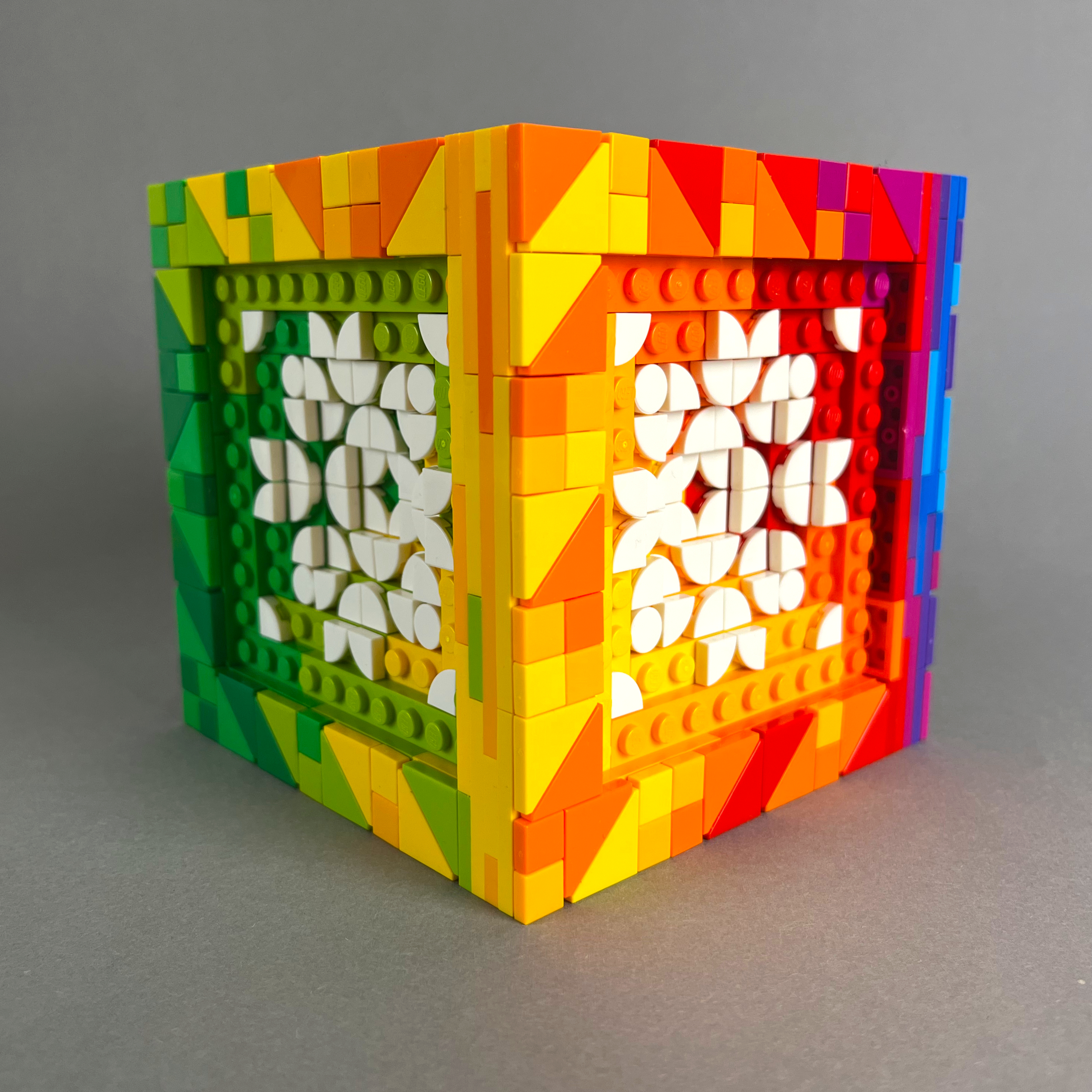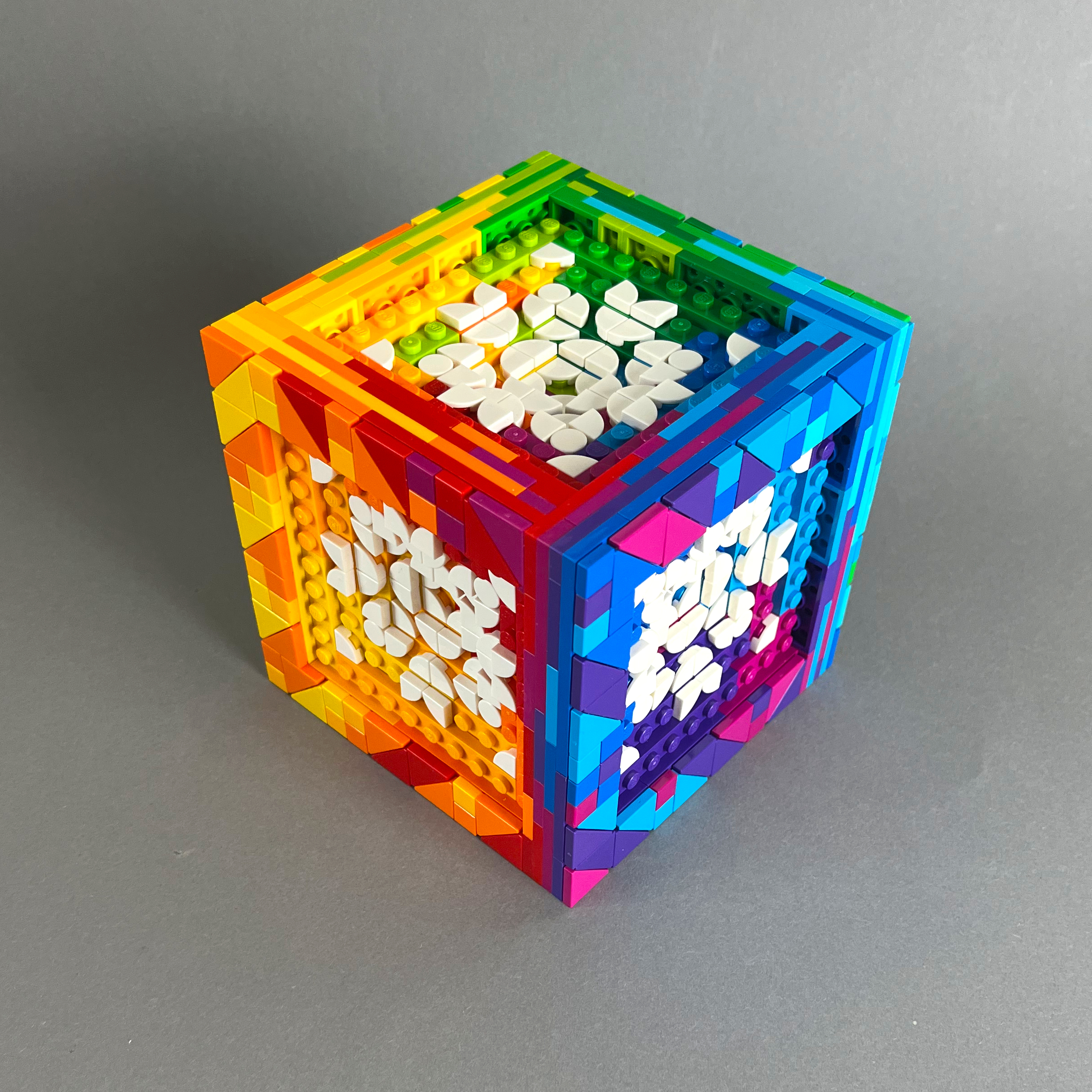 Ebenfalls gebaut für #LetsBuildDistorted auf Instagram. Eine kleinere Version meines Würfels von 2024, bei dem die Grundflächen des Würfels bunt sind und stattdessen die Mosaike komplett weiß sind.