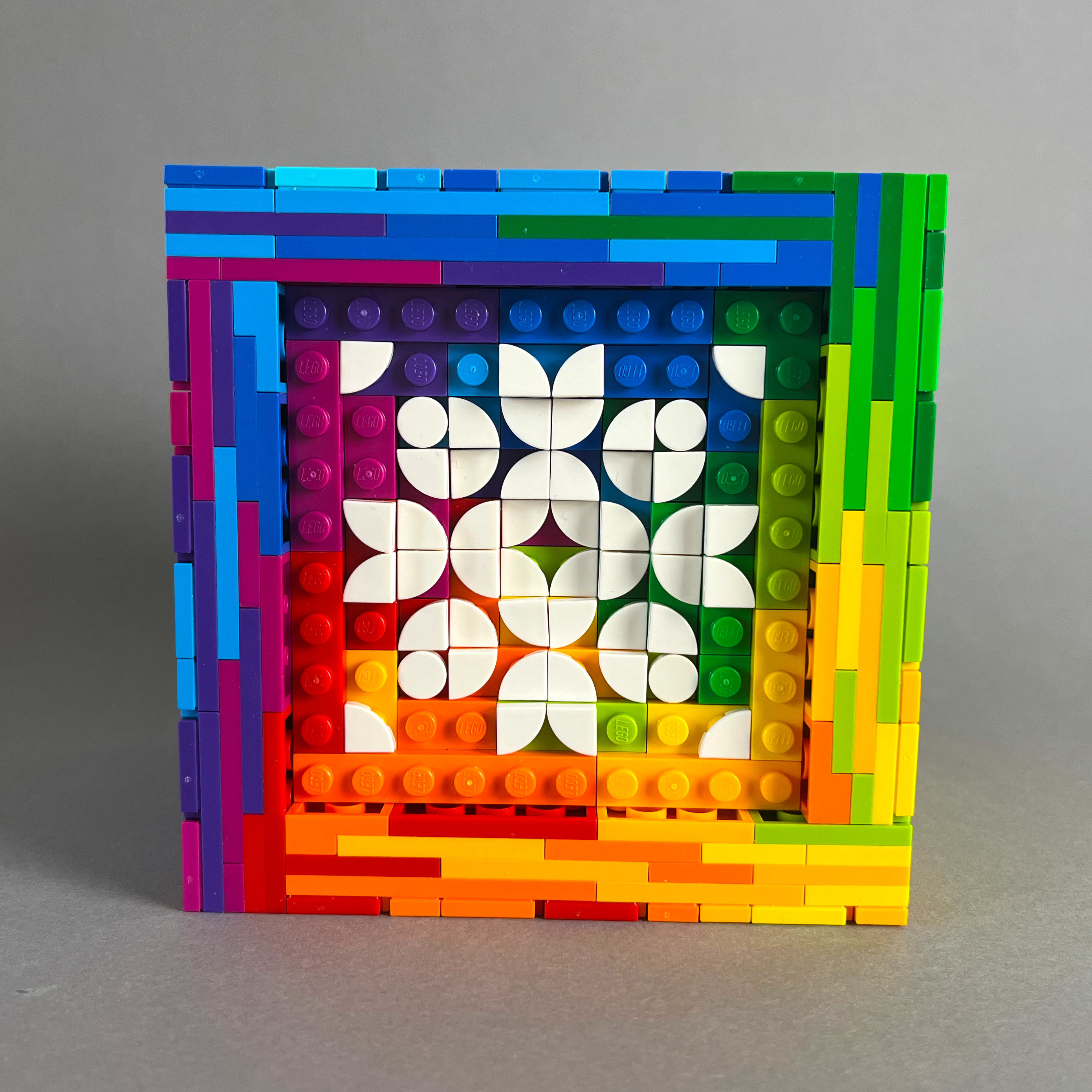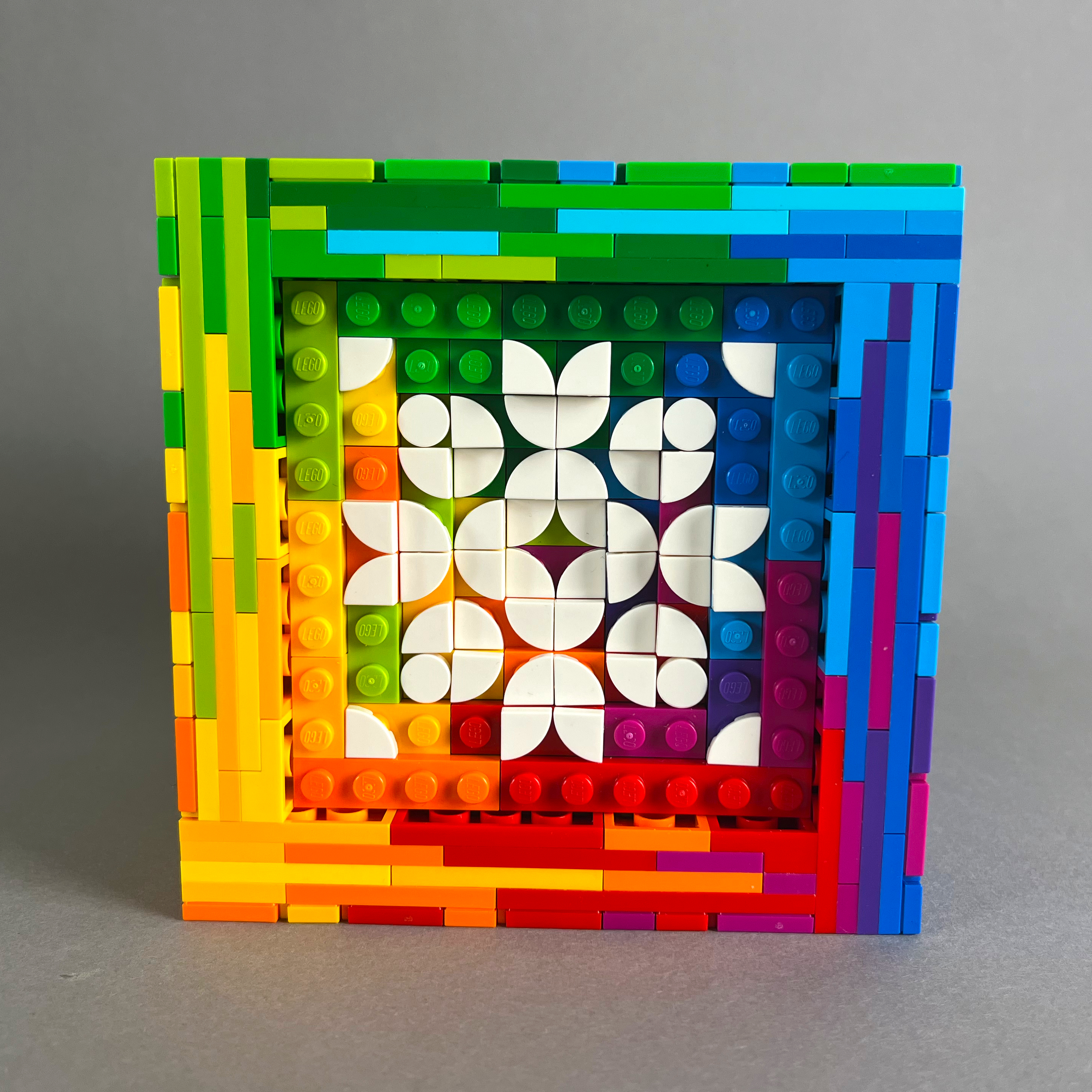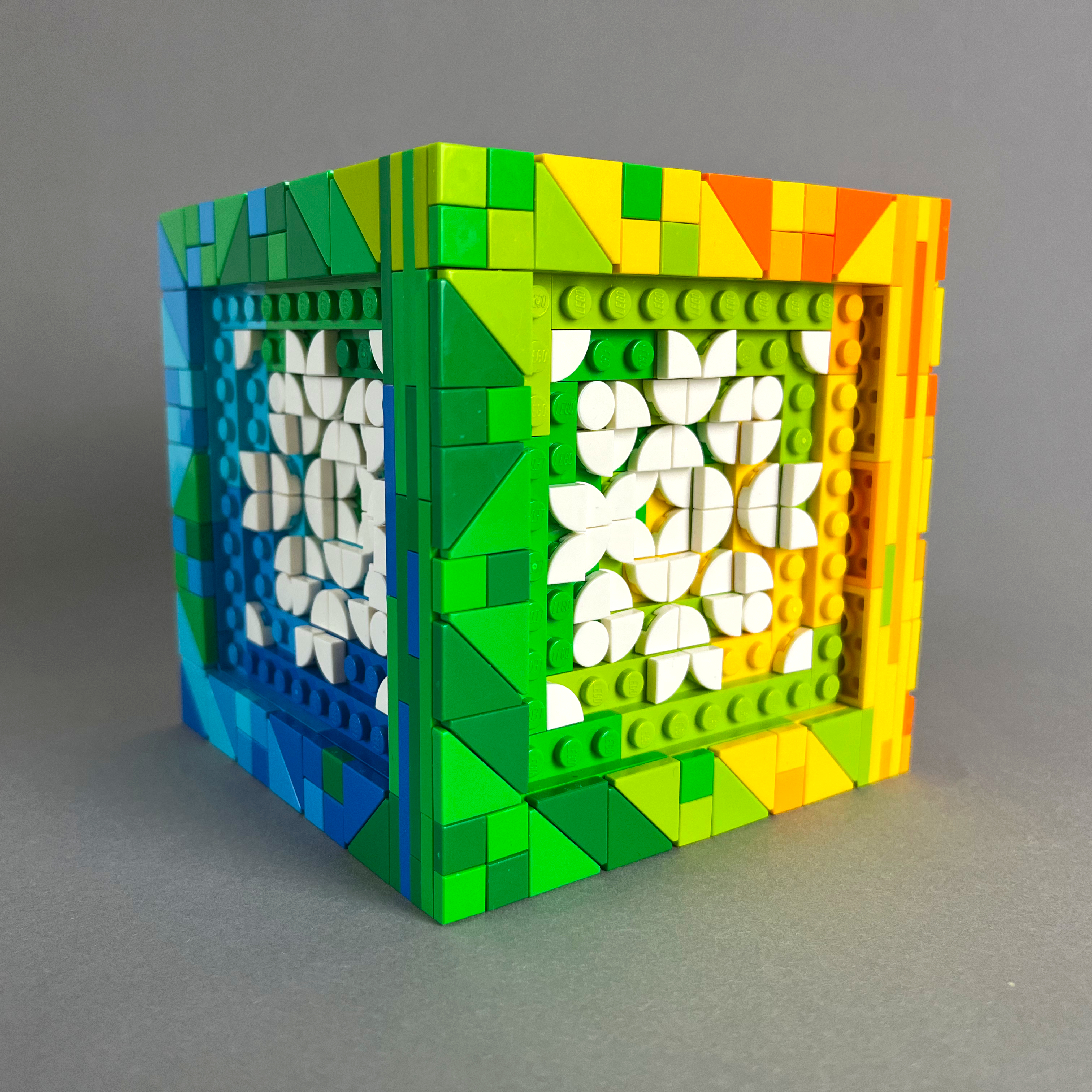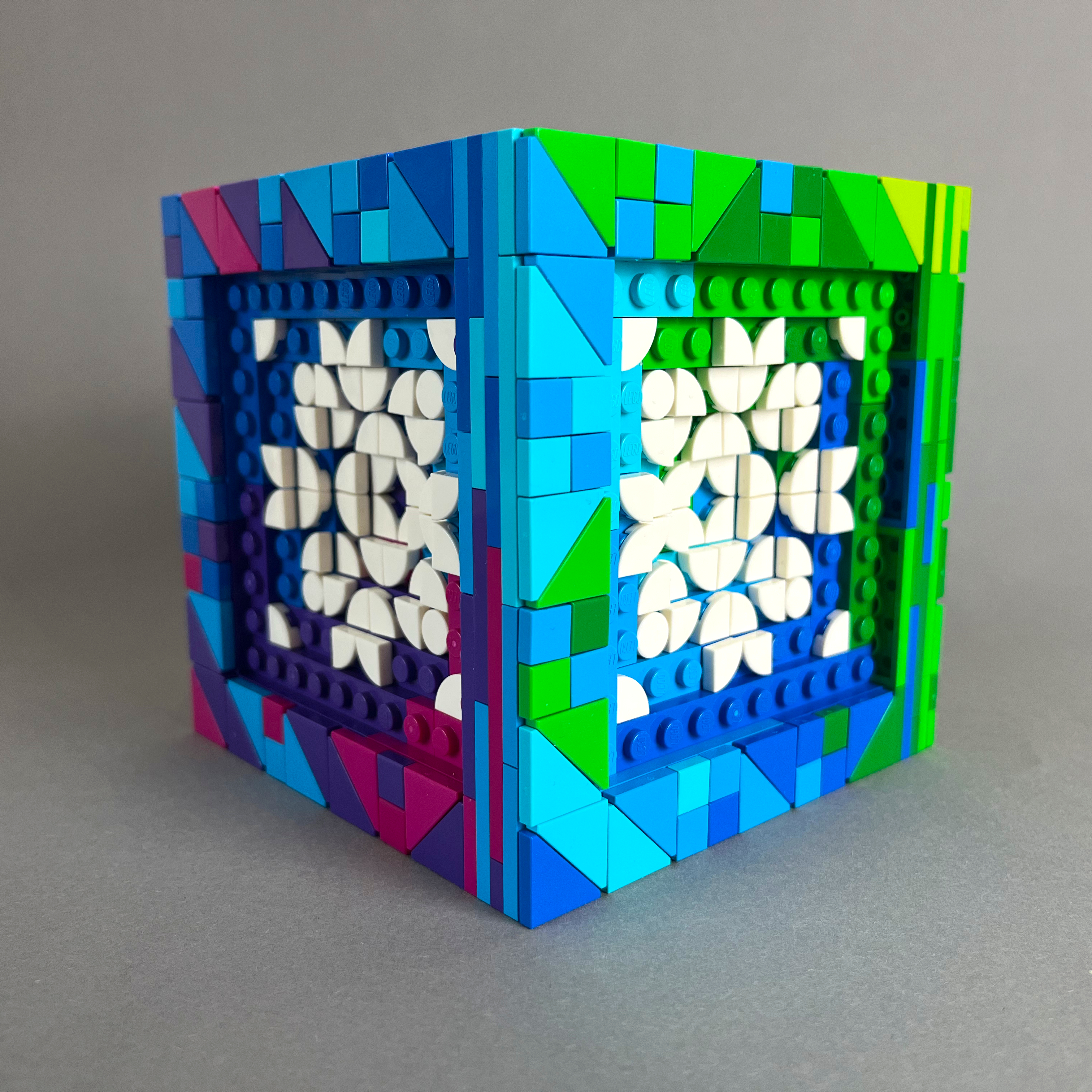 Ebenfalls gebaut für #LetsBuildDistorted auf Instagram. Eine kleinere Version meines Würfels von 2024, bei dem die Grundflächen des Würfels bunt sind und stattdessen die Mosaike komplett weiß sind.